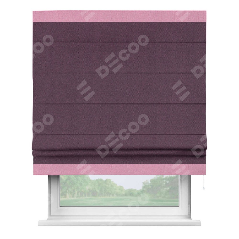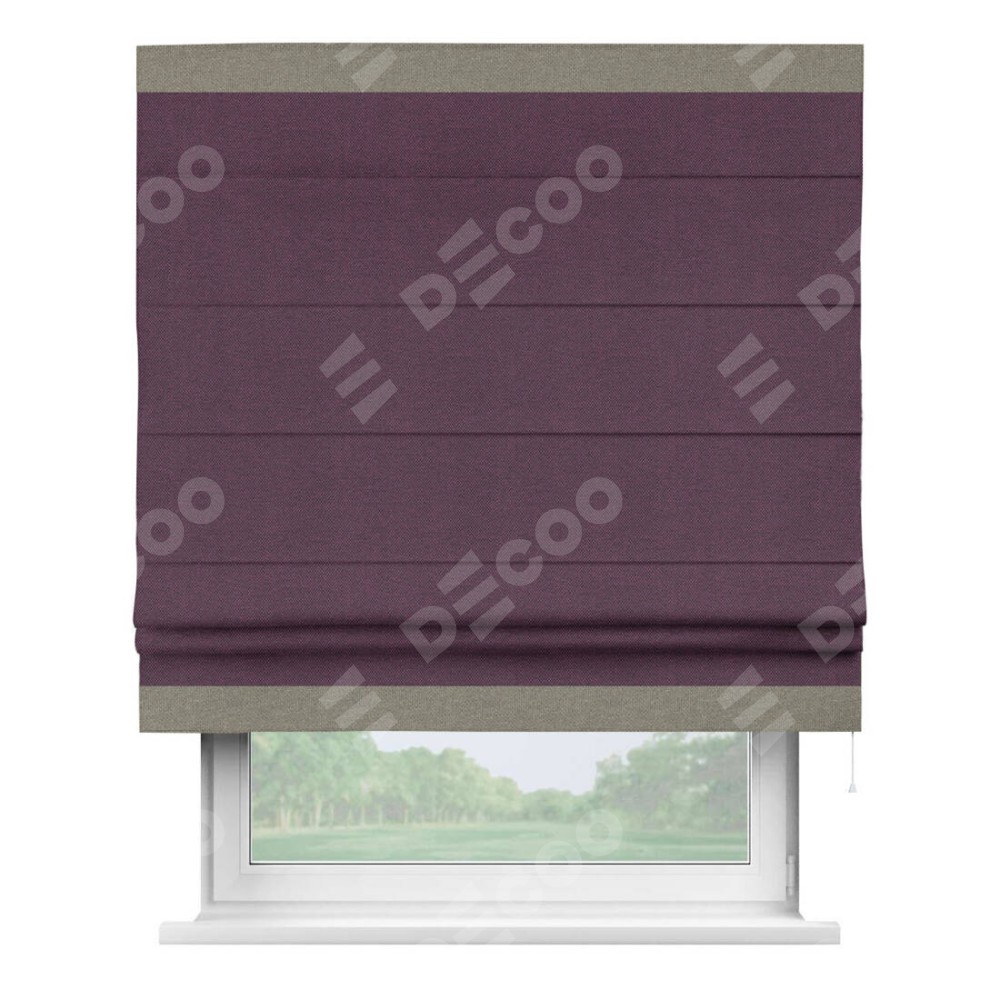 Римская штора производителя «Cortin», используется для проёма, пошита из ткани лён димаут фиолетовый, артикул 8817. Отделка шторы кантом «Горизонт», ткань для канта используется из льна димаут разной расцветки на выбор. Имеет универсальный механизм и подходит для монтажа: на потолок, на стену и в нишу.