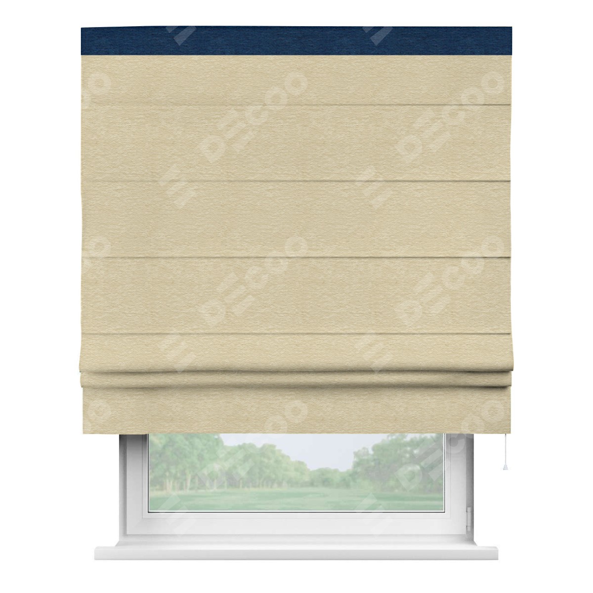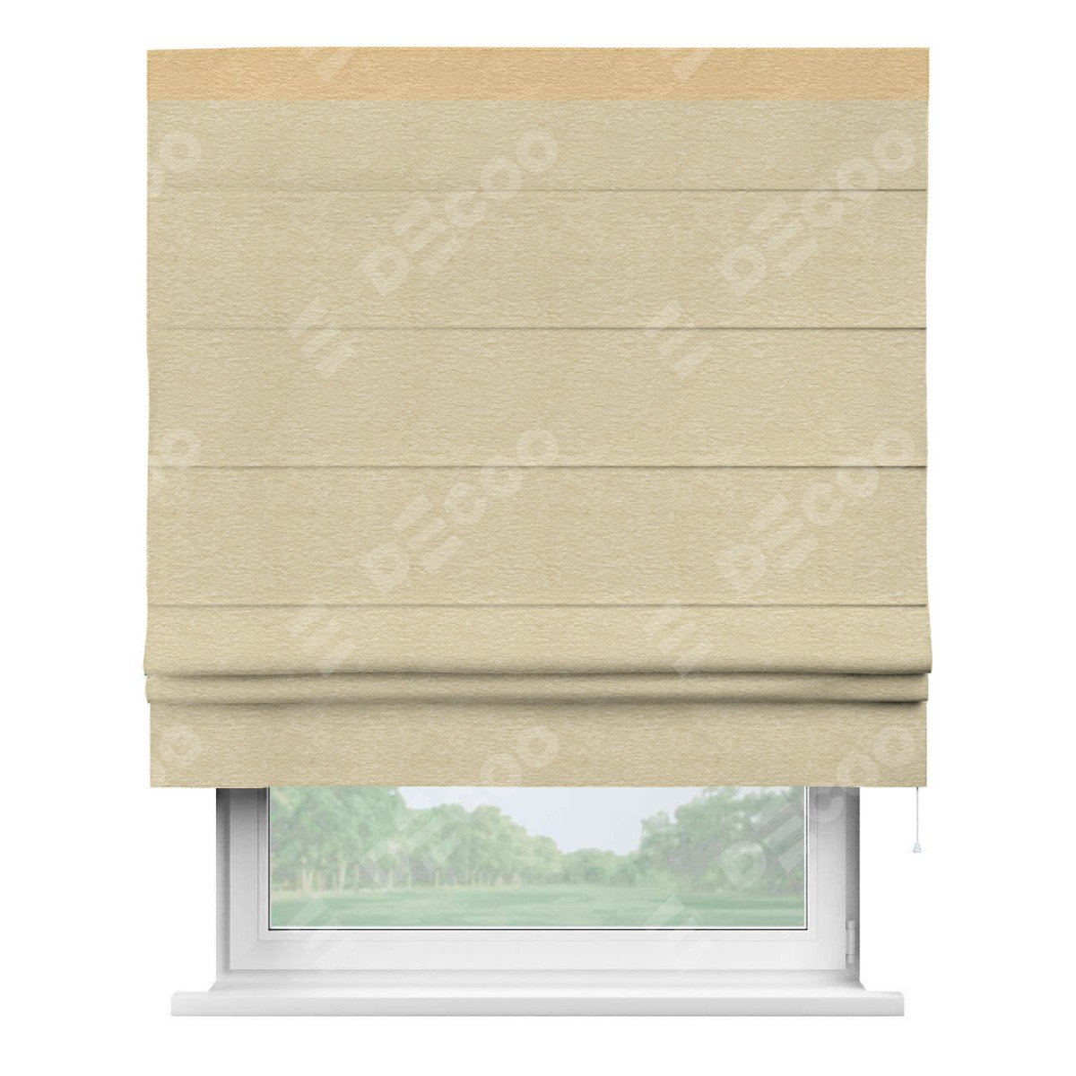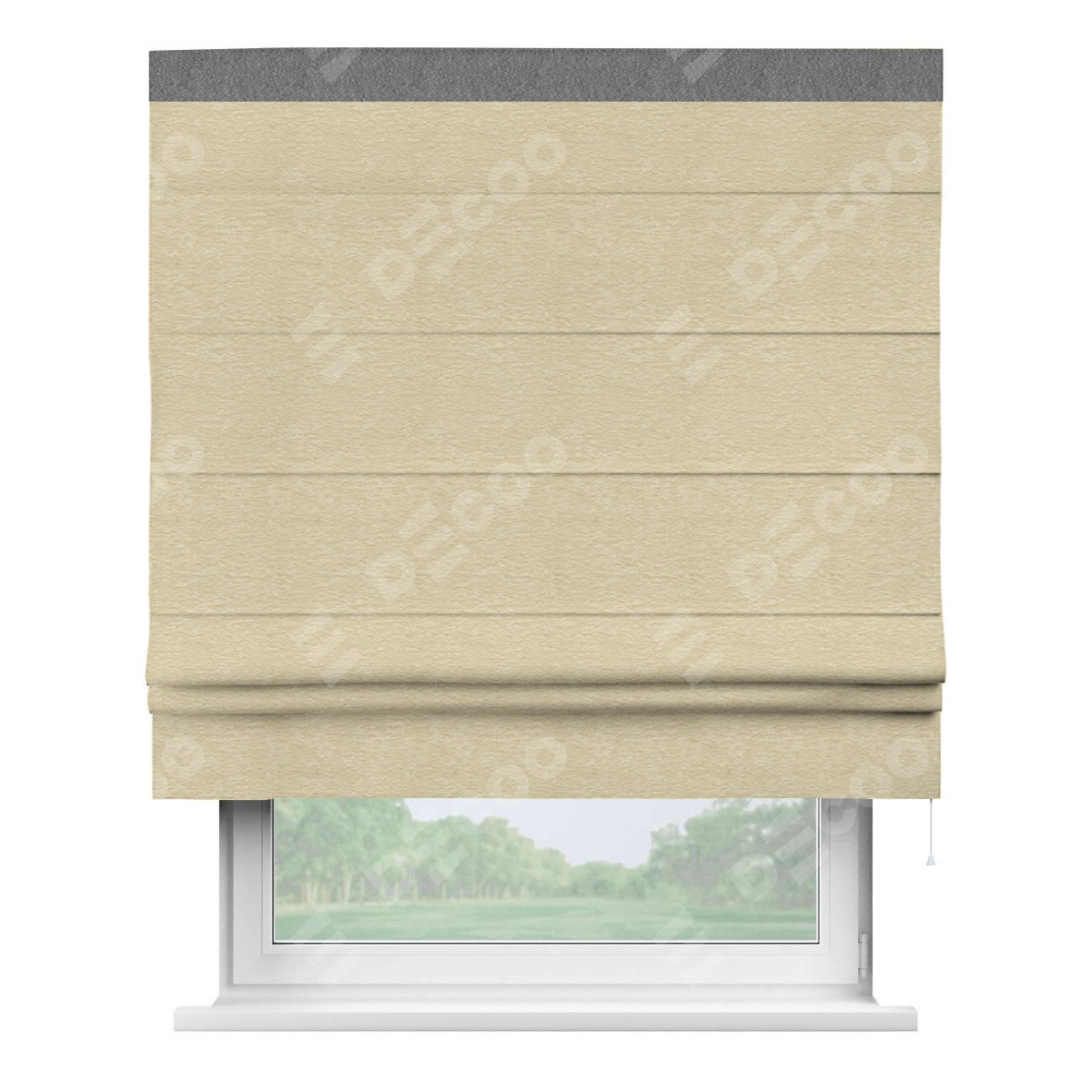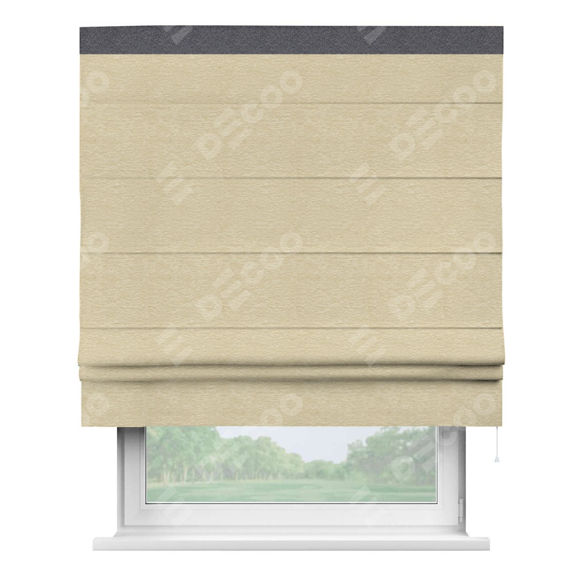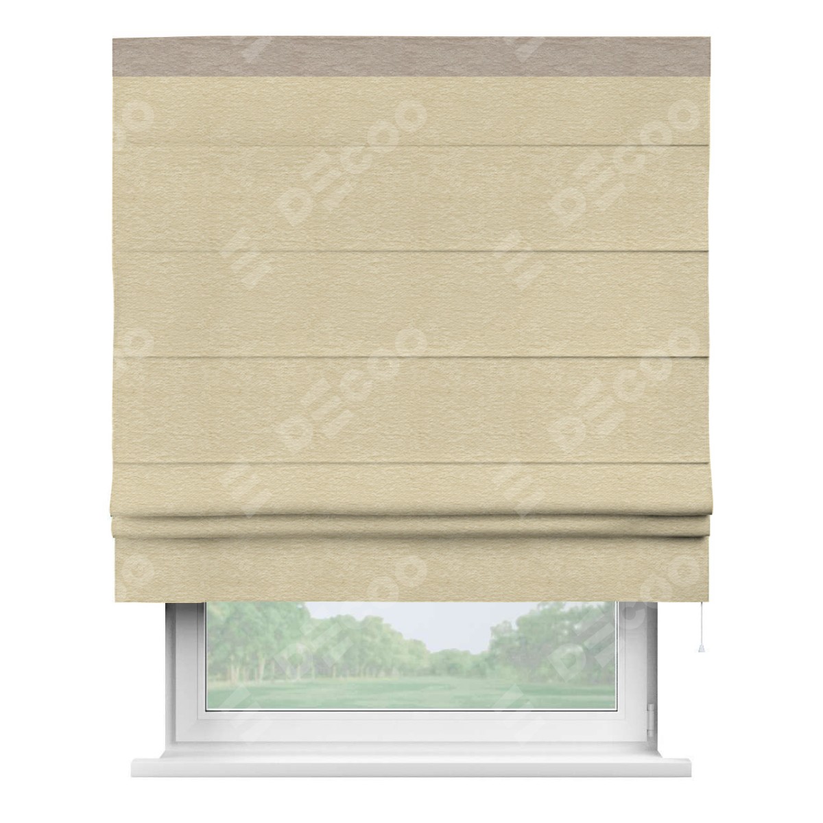 Римская штора производителя «Cortin», используется для проёма, пошита из ткани софт однотонный светло-бежевый, артикул 54426. Отделка шторы кантом «Кинг», ткань для канта используется из софта разной расцветки на выбор. Имеет универсальный механизм и подходит для монтажа: на потолок, на стену и в нишу.
