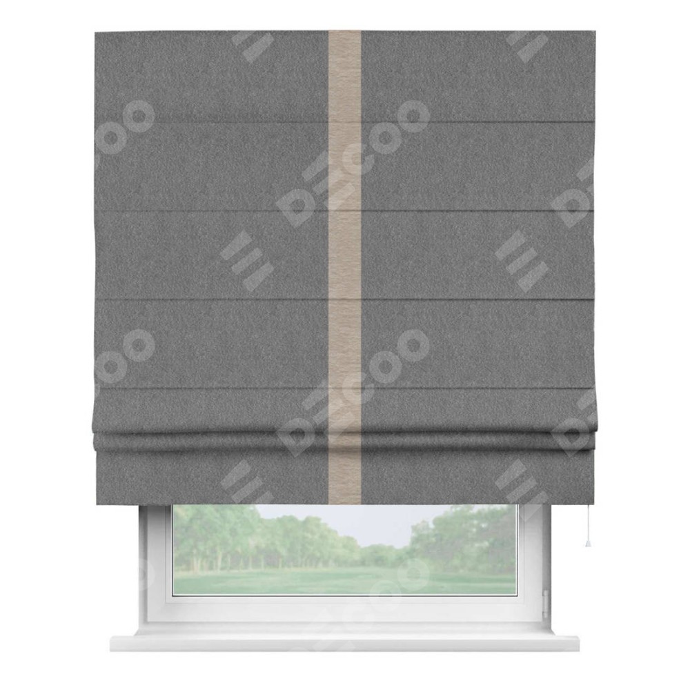 Римская штора производителя «Cortin», используется для проёма, пошита из ткани софт однотонный серый, артикул 70605. Отделка шторы кантом «Хайвэй», ткань для канта используется из софта разной расцветки на выбор. Имеет универсальный механизм и подходит для монтажа: на потолок, на стену и в нишу.