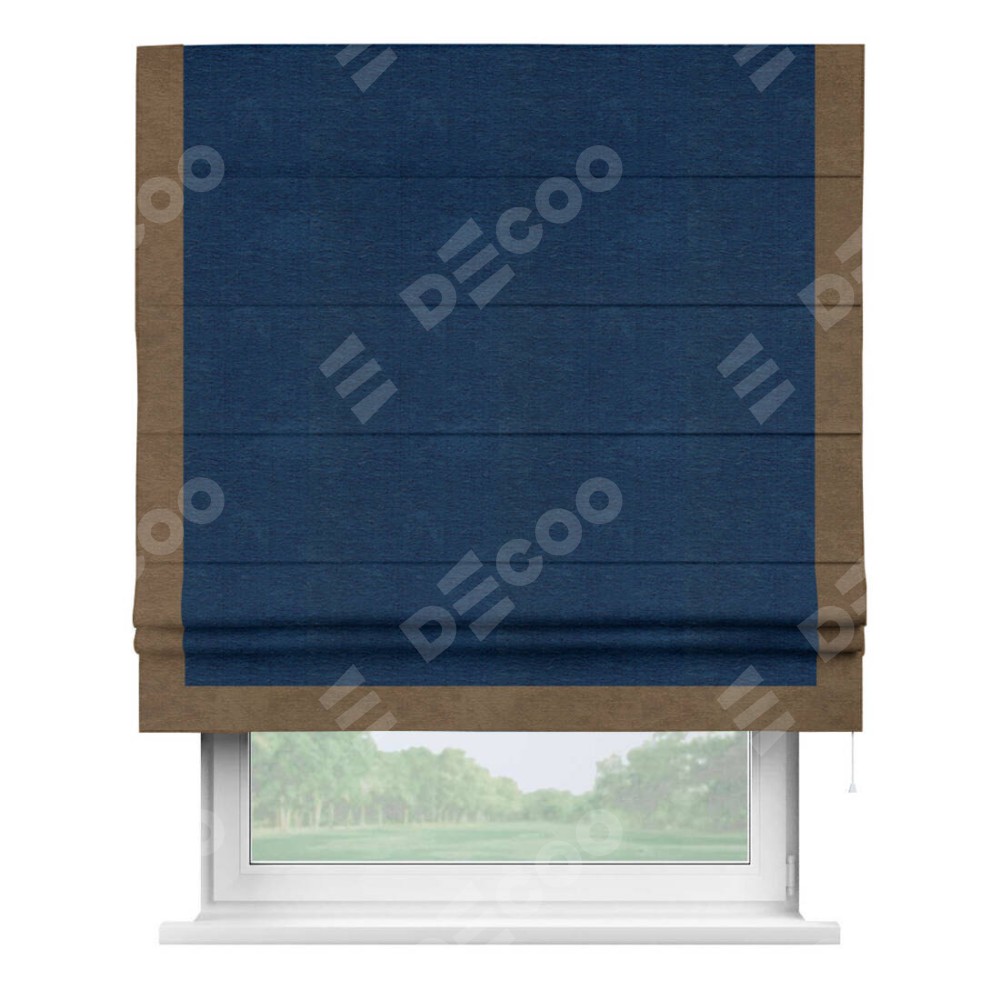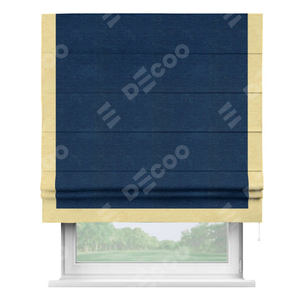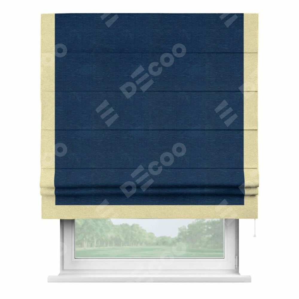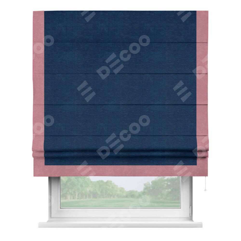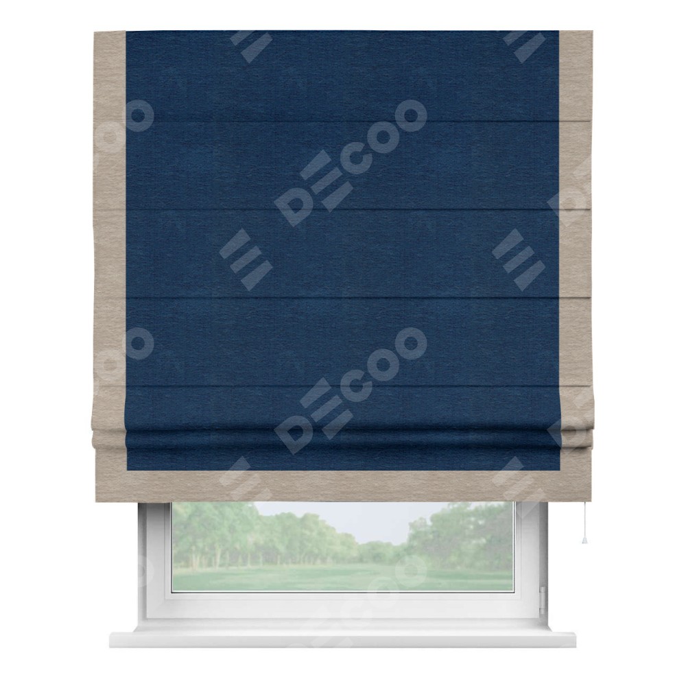 Римская штора производителя «Cortin», используется для проёма, пошита из ткани софт однотонный синий, артикул 42937. Отделка шторы кантом «Виктория», ткань для канта используется из софта разной расцветки на выбор. Имеет универсальный механизм и подходит для монтажа: на потолок, на стену и в нишу.