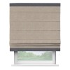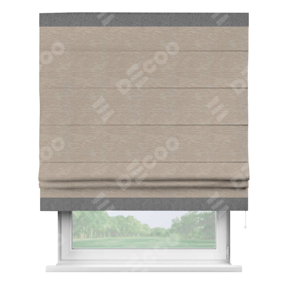 Римская штора производителя «Cortin», используется для проёма, пошита из ткани софт однотонный темно-бежевый, артикул 1640. Отделка шторы кантом «Горизонт», ткань для канта используется из софта разной расцветки на выбор. Имеет универсальный механизм и подходит для монтажа: на потолок, на стену и в нишу.