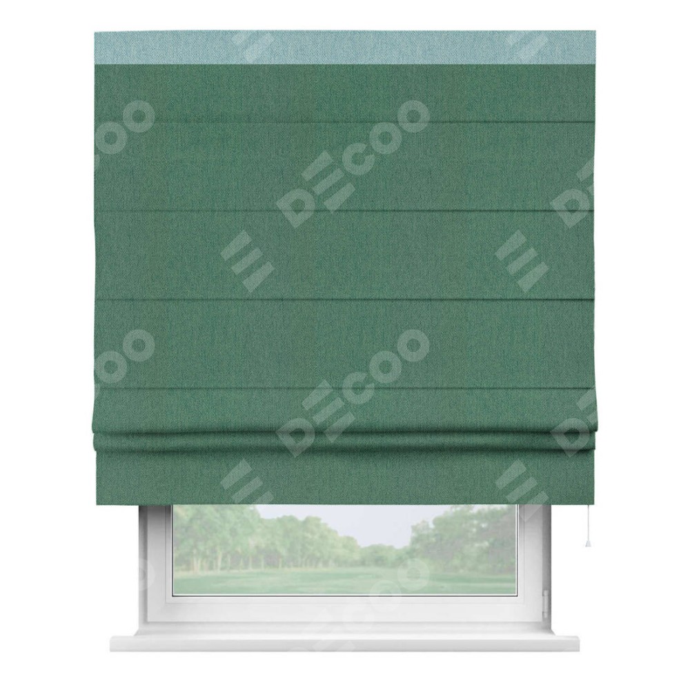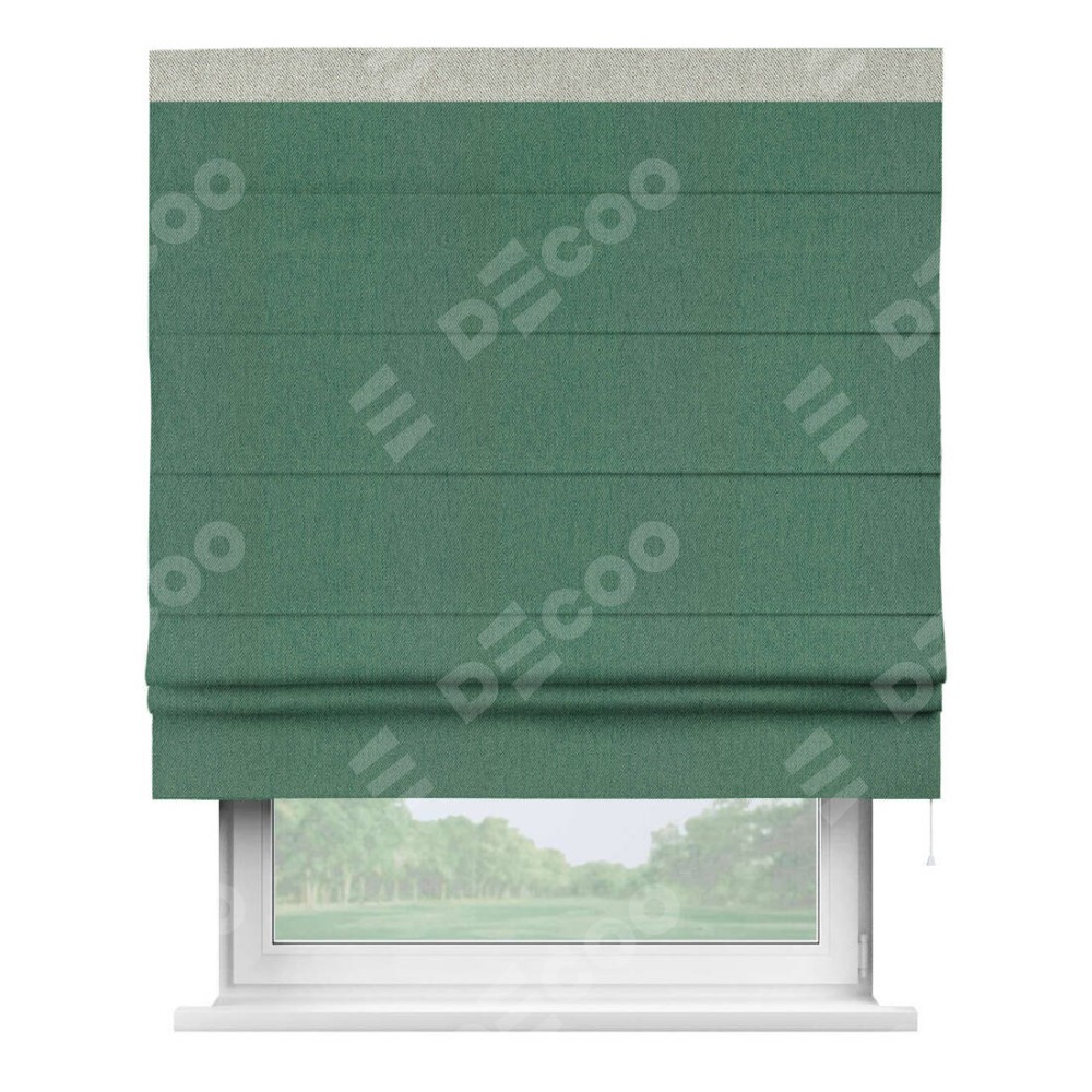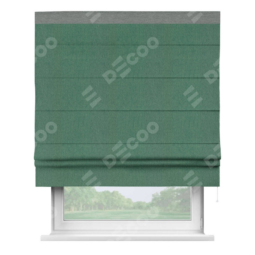 Римская штора производителя «Cortin», используется для проёма, пошита из ткани твид блэкаут зелёный, артикул 21589. Отделка шторы кантом «Кинг», ткань для канта используется из твида разной расцветки на выбор. Имеет универсальный механизм и подходит для монтажа: на потолок, на стену и в нишу.