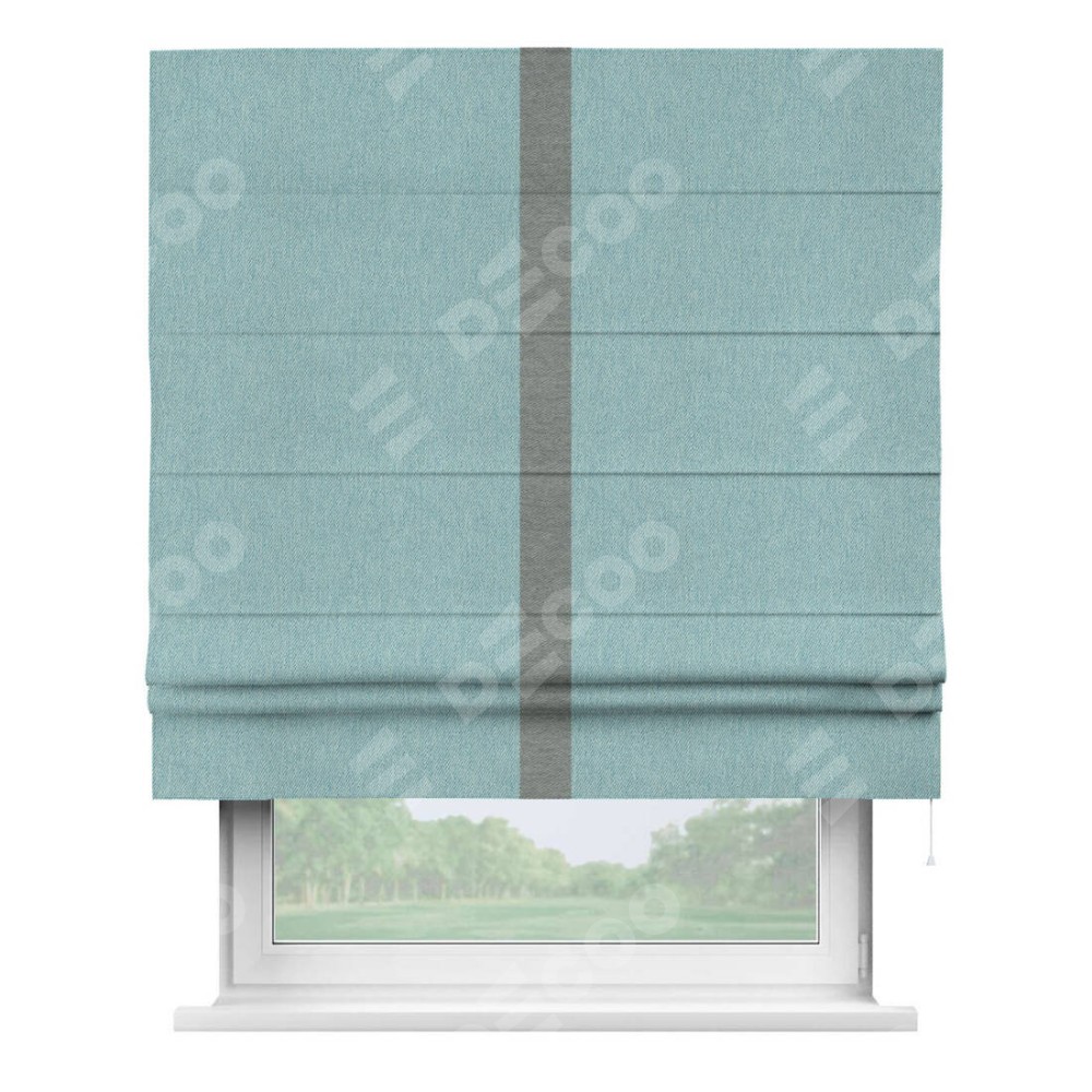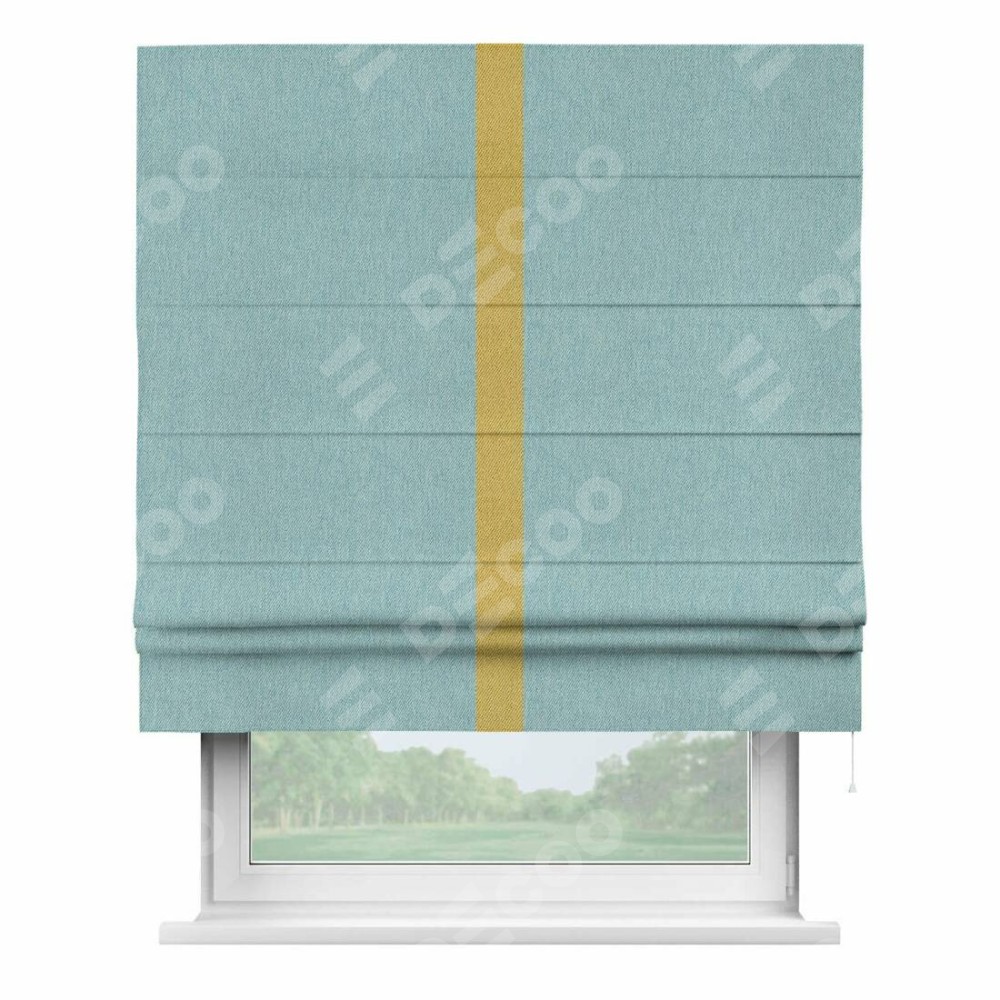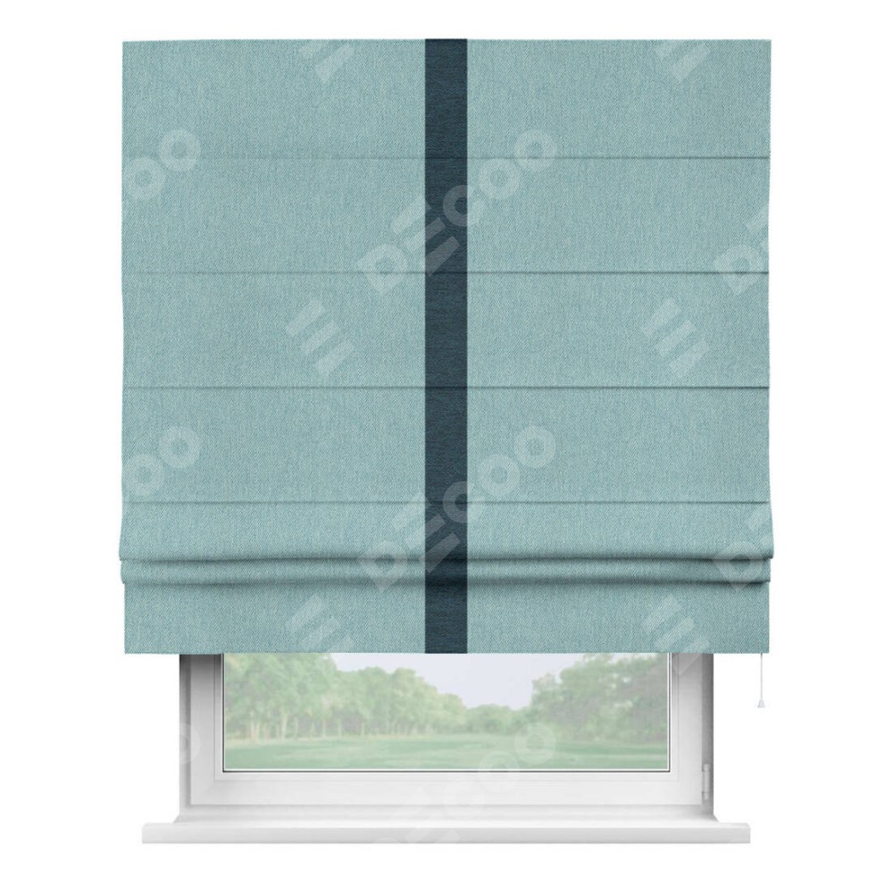 Римская штора производителя «Cortin», используется для проёма, пошита из ткани твид блэкаут небесно-голубой, артикул 21578. Отделка шторы кантом «Хайвэй», ткань для канта используется из твида разной расцветки на выбор. Имеет универсальный механизм и подходит для монтажа: на потолок, на стену и в нишу.
