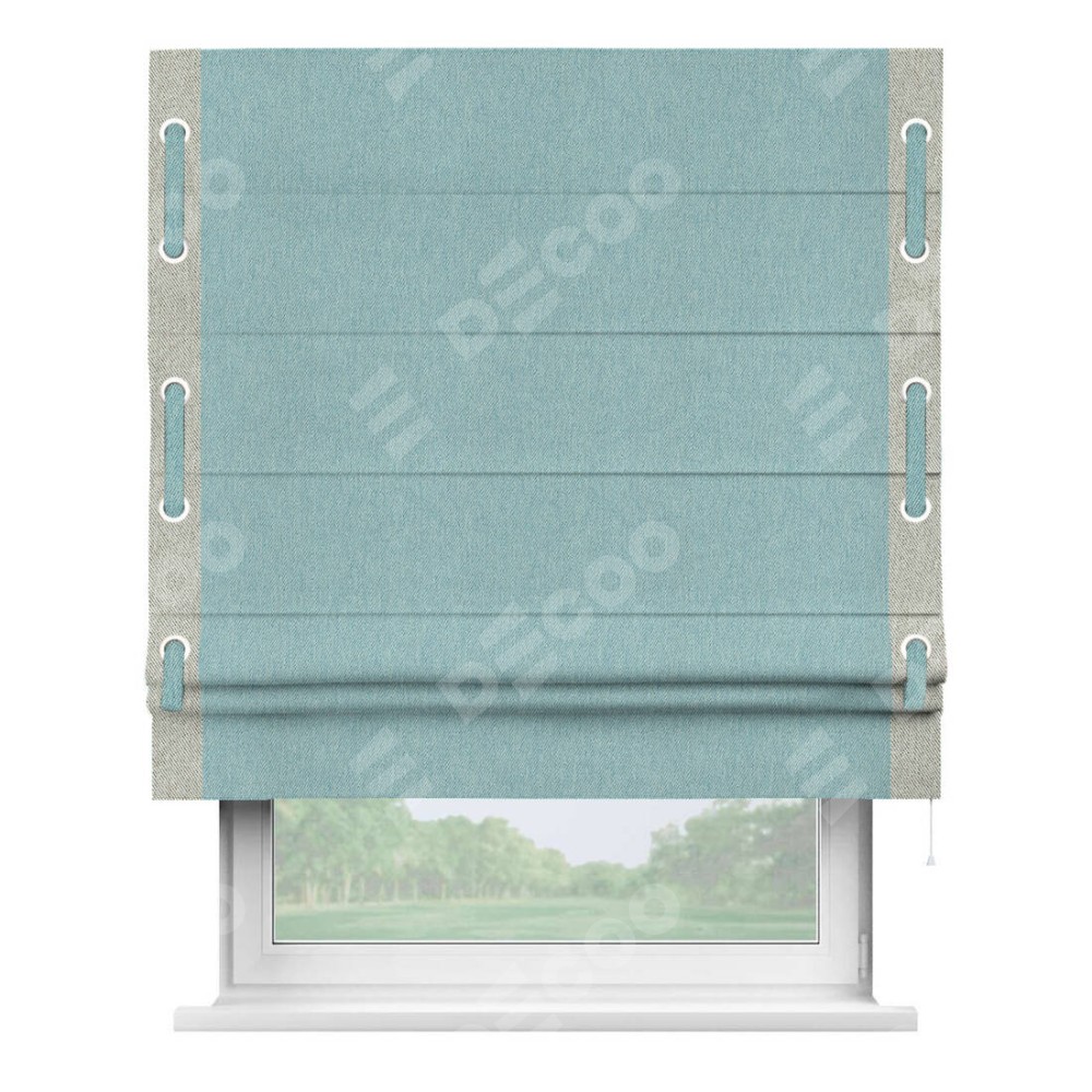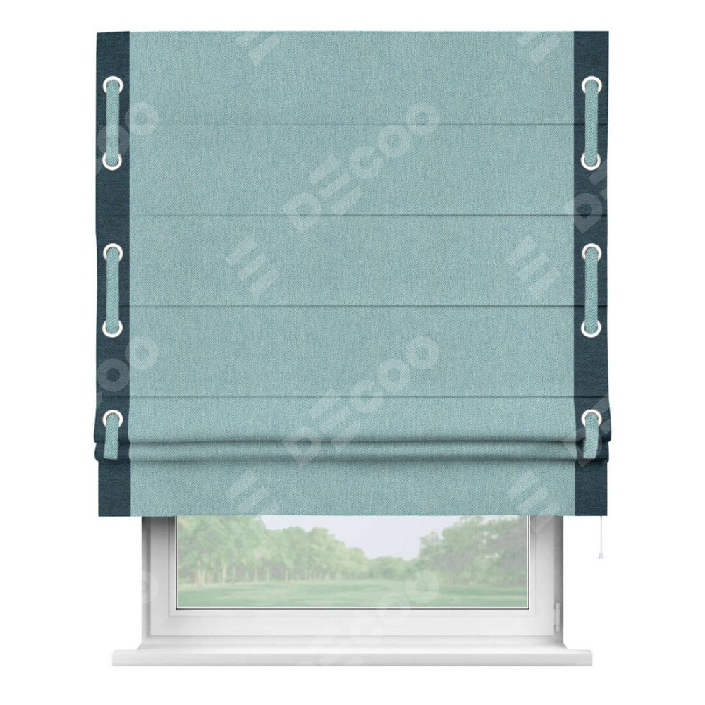 Римская штора производителя «Cortin», используется для проёма, пошита из ткани твид блэкаут небесно-голубой, артикул 21578. Отделка шторы кантом «Стрим Дуо» на кантах расположены люверсы с пояском, ткань для канта используется из твида разной расцветки на выбор. Ткань для пояска обычно используется из основной ткани шторы, а так же можно сделать из любой расцветки по желанию. Имеет универсальный механизм и подходит для монтажа: на потолок, на стену и в нишу.