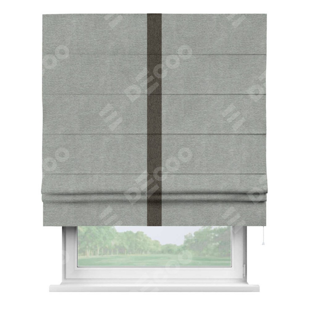 Римская штора производителя «Cortin», используется для проёма, пошита из ткани твид блэкаут светло-серый, артикул 21576. Отделка шторы кантом «Хайвэй», ткань для канта используется из твида разной расцветки на выбор. Имеет универсальный механизм и подходит для монтажа: на потолок, на стену и в нишу.