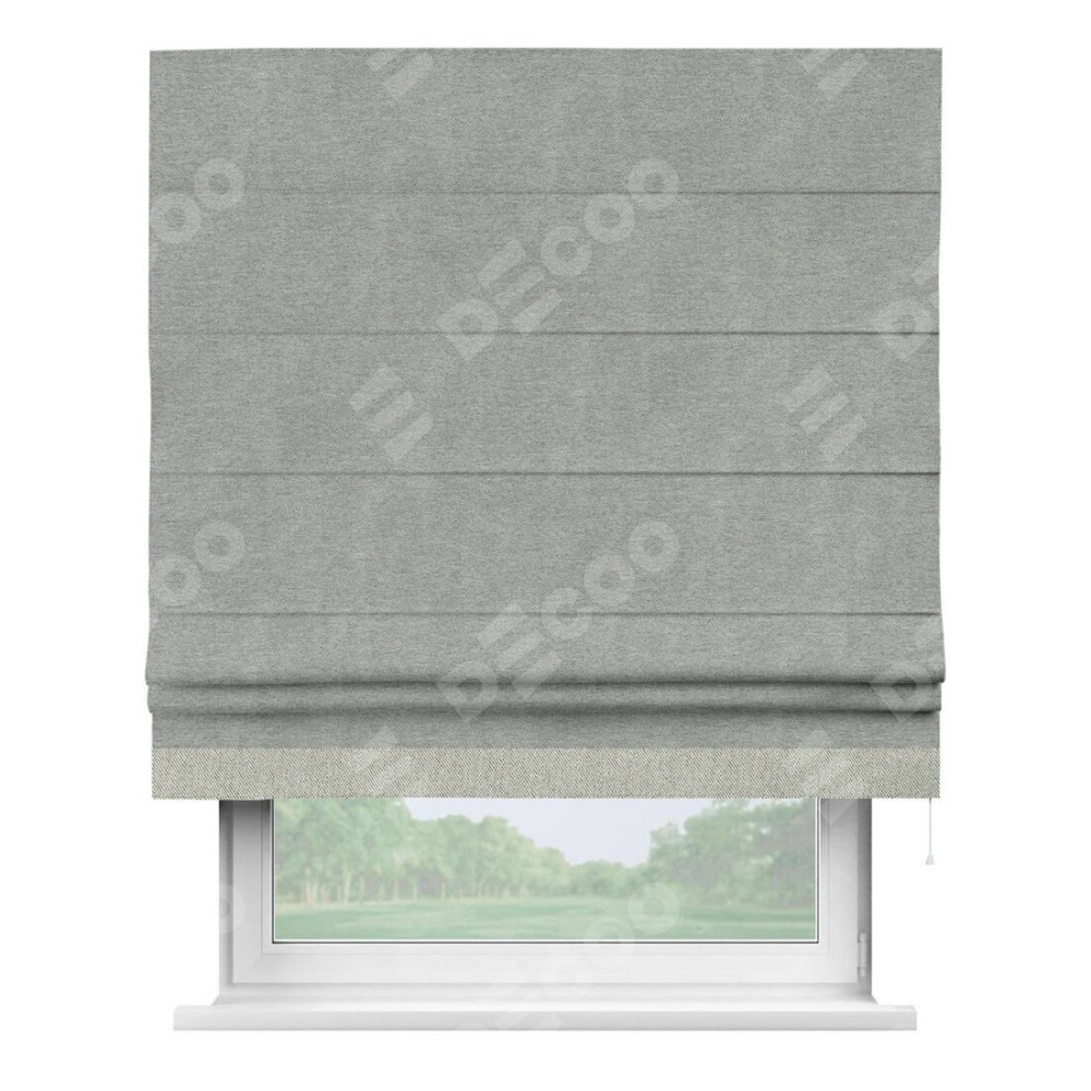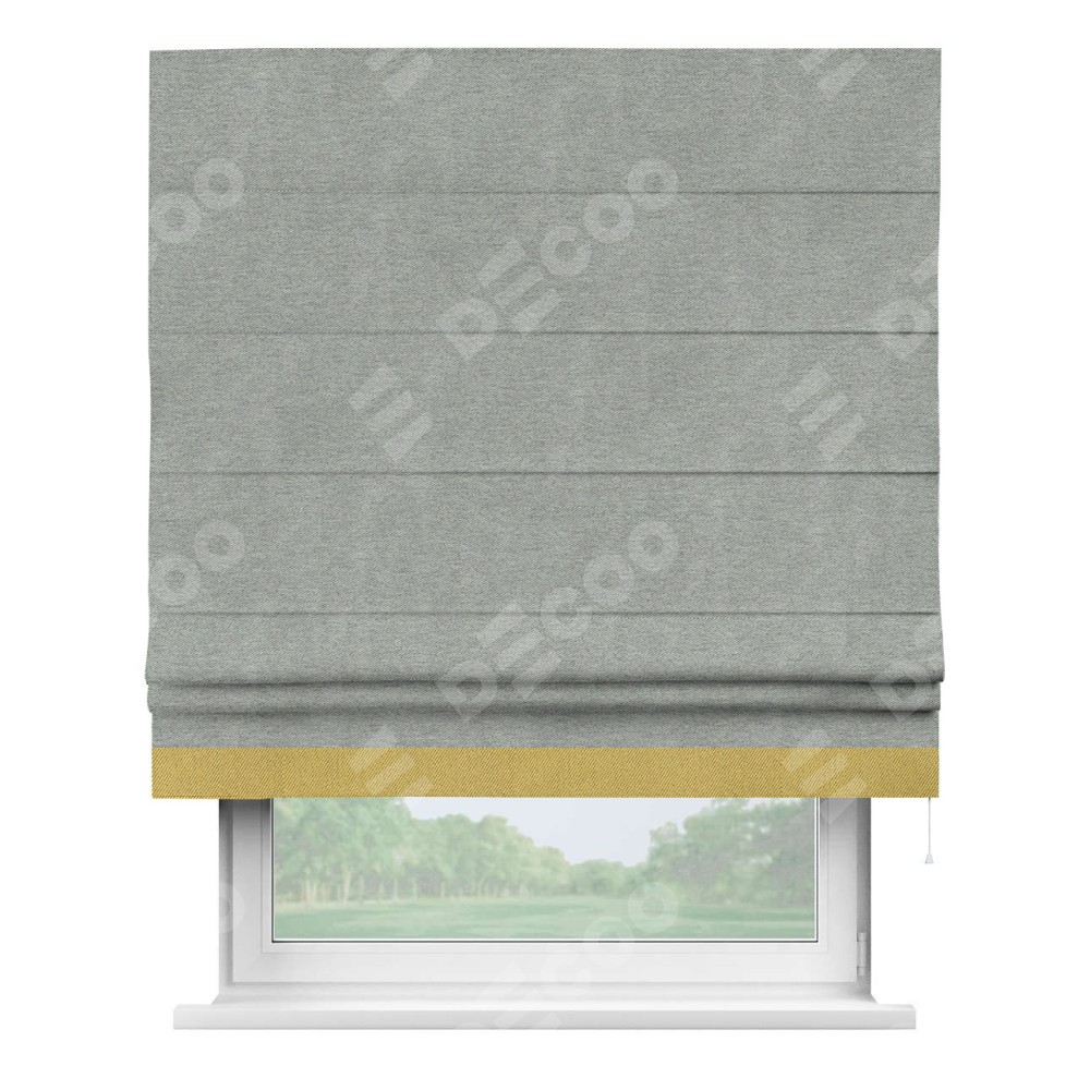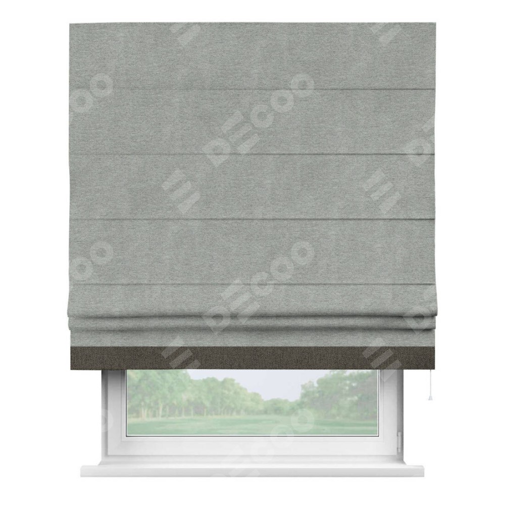 Римская штора производителя «Cortin», используется для проёма, пошита из ткани твид блэкаут светло-серый, артикул 21576. Отделка шторы кантом «Джестер», ткань для канта используется из твида разной расцветки на выбор. Имеет универсальный механизм и подходит для монтажа: на потолок, на стену и в нишу.