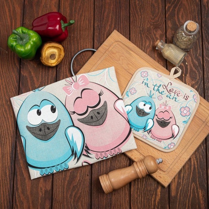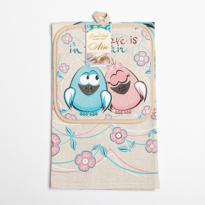 Кухонный набор Птички парочка (полотенце 45×60+прихватка 18×18) полулен, 160г/м