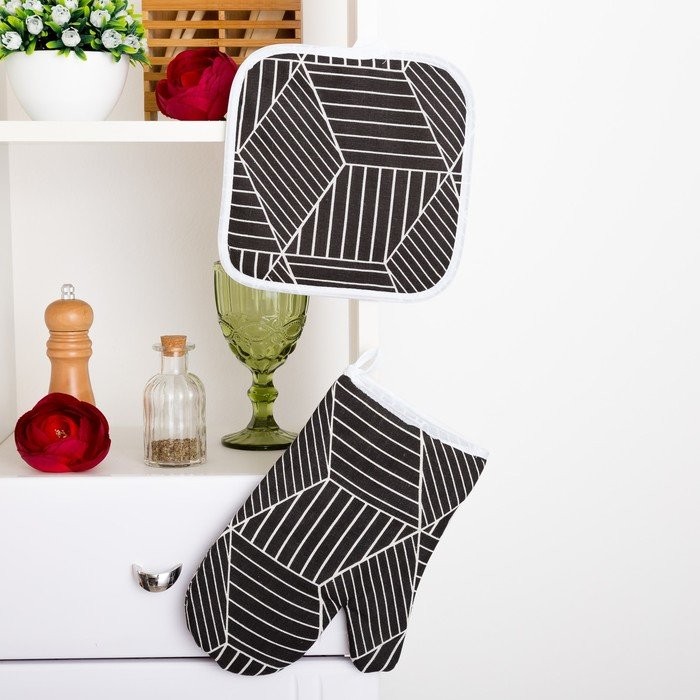 Набор Доляна фартук/прихватка/варежка, Тренд черн, 100%пэ, рогожка 200 гр/м