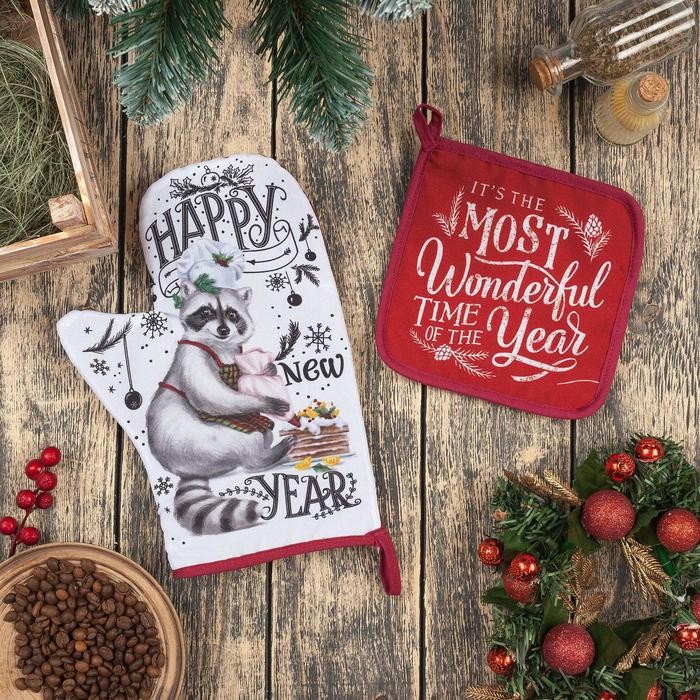 Набор кухонный Happy new year: варежка-прихватка 20х28см, прихватка 17×17 35% хл,65% п/э