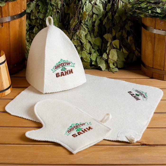 Для комфортного отдыха в парной возьмите с собой набор банных принадлежностей. Предметы из этого комплекта предохраняют тело от перегрева и являются средствами индивидуального пользования. Влажные изделия рекомендуется сушить в расправленном виде на горизонтальной поверхности. Принадлежности из войлока и фетра стирайте вручную при температуре воды 30 °C.
