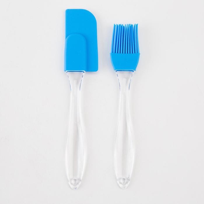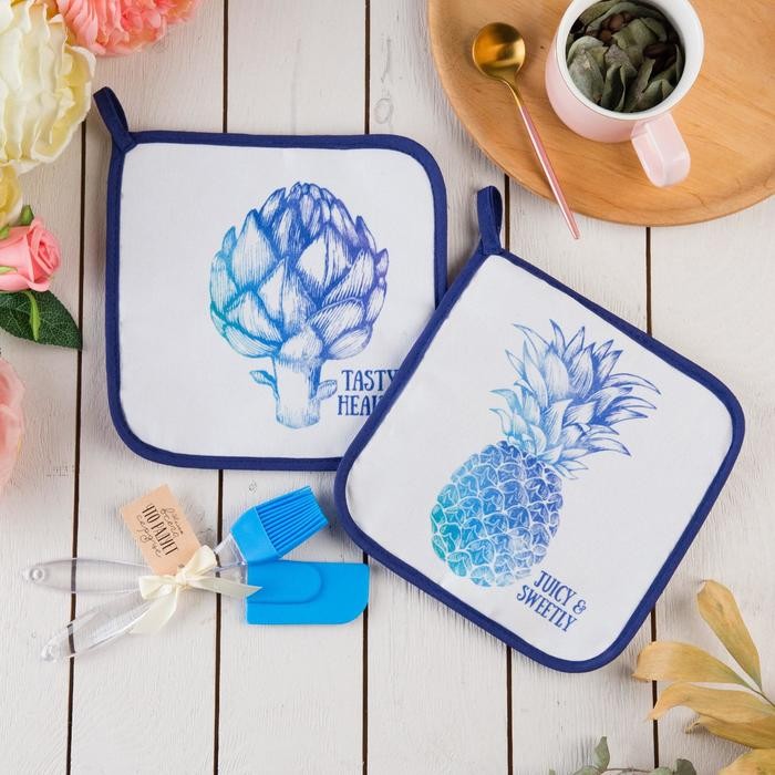 В набор входит 2 прихватки 19 × 19 см, силиконовые лопатка и кисточка.